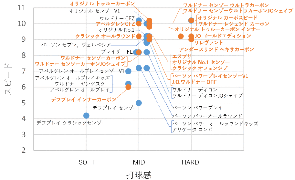 横軸の打球感は、出典中の表にはH*とか、S*と表示されていますが、下のグラフでは